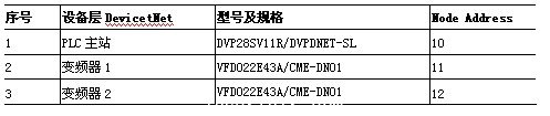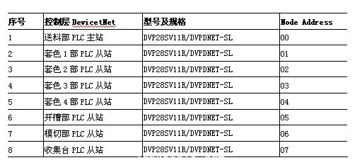 由于版面原因,编码器数量不能全部标示出来。另外,各个机构的位置调整,只是在更换生产料号时才动作,因此客户为了节省成本,每个机台只安装2台变频器作调速定位,依靠外部接触器切换各个机构的电机工作,因此每次最多只有2个位置调整机构同时动作。人机界面通过Ethernet网络,先访问DeviceNet控制层的主站送料部PLC,再通过DeviceNet网络访问到各个从站PLC。每一个机台的2个PLC通过RS485的PLC-Link方式交换数据。地址(Node Address)分配如表2、3所示。
