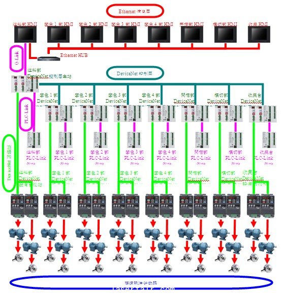 每一个机台的PLC通过DeviceNet总线网络连接起来,相互之间交换所需信息,以及控制命令,达到在其中一个机台能够监视各部分器件的状况,控制和调整每一部分机构,或紧急停止远程其他机台的效果。这样做,一方面同时免去繁多的硬接线,另一方面可以在多种产品同类部件间实现互换性的同时,减少配线和安装工业自动化设备的成本和时间。通过DeviceNet总线,可以根据位移实时调整变频器输出频率,调整加减速线性,实现平稳启停,以及配合旋转编码器测量位移位置,达到精确定位的效果。同时监控变频器的工作状况(包括运行状态、输出频率、输出电流、报警内容等)。通过Ethernet网络的触摸屏可以直接设定远程每一个机台的PLC参数,以及收集该机台的工作状况和报警信息。这样通过DeviceNet的直接互相连性不仅改善了设备间的通信,同时提供了相当重要的故障诊断功能,实现了低成本、高性能的工业设备的网络互连。