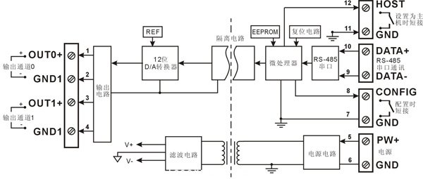 ISO DAO信号D/A(数字转模拟)转换器是基于单片机的智能监测和控制系统,所有的用户设定的校准值,地址,波特率,数据格式,校验和状态等配置信息都储存在非易失性存储器EEPROM中。