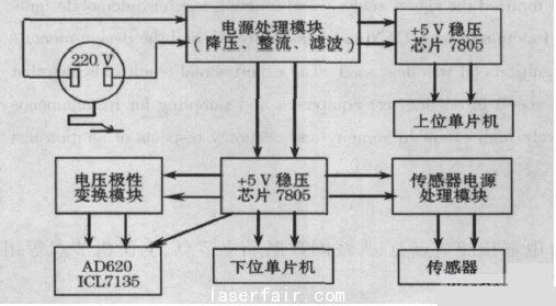 在主节点部分,通过总电源处理模块,将交流220 V 转换为直流12 V ,上位机的电源由自身的5 V 稳压模块提供,通过总电源线将12 V 直流输送到下位机,下位机及其外围器件所需的电源都由下位机的电源模块提供,个别器件所需的特殊电压,由专用模块获得。
