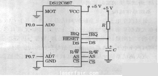 采用实时时钟芯片DS12C887 为系统产生时间基准,它和单片机的连接如图9 所示。可当作单片机的外部RAM处理,通过P0 口对DS12C887 进行操作,通过其中断引脚IRQ向单片机发出中断,使单片机读出时间。