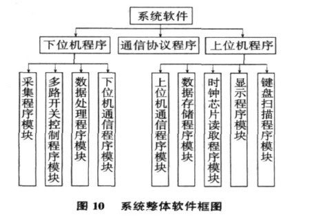 系统软件框图如图10 所示。一级目录分为上位机程序、通信程序和下位机程序;二级目录分为数据采集程序模块、模拟多路开关控制程序模块、数据处理程序模块、下位机通信程序模块、上位机通信程序模块、显示程序模块、存储程序模块、时钟程序模块以及键盘控制模块。每个二级程序模块又由更小的函数组成,这样的设计方法容易修改和测试。
