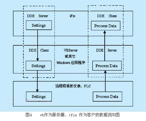 在vbserver中,把采集到的实时数据赋给textbox(文本框),并把ifix中各点的dde地址的项目名设为对应的textbox(文本框)。如油漆烘间的实测温度,在ifix中点名为ai_oven_tem,其dde地址vbserver|formmain|txtoventem(其中vbserver是应用程序名,formmain是作为主题的窗体名,txtoventem是作为项目的文本框名称)。此时,ifix为客户,vb应用程序为服务器。