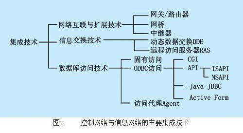 为方便讨论问题、现举例说明。根据某生产自动化改造工程要求,需要对系统进行组态监控操作平台设计,采用组态软件ifix2.2和windows应用软件vb6.0,开发并实现基于dde机制的进程间数据交换,满足工业控制网scada工控计算机内部信息交换需要,为各应用程序通过共享内存交换信息,实现控制网络与信息网络的集成,并为进一步进行windows程序间的数据交换开发提供有借鉴意义的参考[3]。控制网络与信息网络的主要集成技术如图2所示。