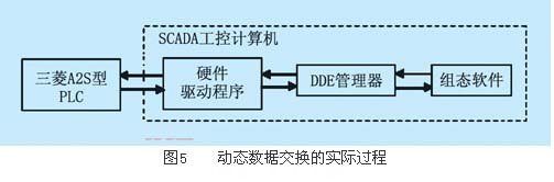 dde管理器作为服务端通过驱动程序从plc的内存中采集到数据,与组态进行数据交换后又通过驱动程序写入plc的内存区,这一过程的示意图如图5所示。