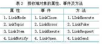 vb中支持dde的对象有5类:窗体(form)、多文档窗体(mdiform)、标签(label)、文本框(textbox)和图片框(picturebox)。其中,窗体和多文档窗体可作为dde服务器即数据的提供者,label、textbox和picturebox等可以作为dde服务器即数据的接收者。vb为支持dde给发送端对象提供了2种dde属性和4种dde事件,给接收端对象提供了4种dde属性、4种dde事件和4种dde方法(见表2)。#p#分页标题#e#