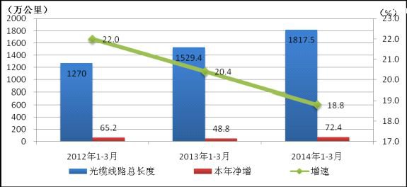 1-3月,全国新建光缆线路72.4万公里,光缆线路总长度达到1817.5万公里,同比增长18.8%,保持较快增长态势。接入网光缆、本地网中继光缆和长途光缆线路所占比重分别为46.5%、48.5%和5%。接入网光缆和本地中继光缆长度同比增长20.1%和19.5%,分别新建24.1万公里和47.2万公里;长途光缆保持小幅扩容,同比增长3.5%,新建长途光缆长度1.1万公里。