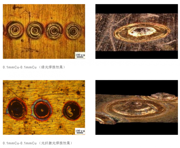 采用绿光激光分别对0.1mm厚紫铜与0.1mm厚紫铜搭接焊,以及0.1mm厚紫铜与0.2mm厚铝合金搭接焊。焊后表面无需清理,无飞溅产生,焊点大小均匀,焊点成型好,焊接质量高,同时,在焊接过程中保持稳定,所需能量也更低。