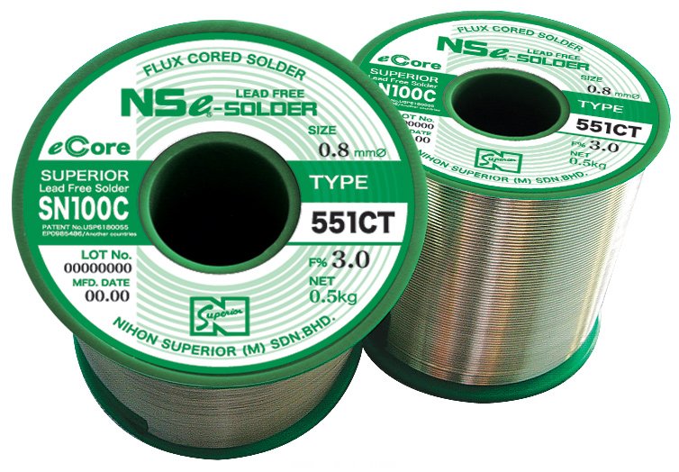 SN100C(551CT)是一种新型无铅焊锡丝,也是SN100C无铅焊料系列产品的最新成员,它融合了共晶无铅合金的优势和助焊剤的稳定性及耐高温能力,适用于高速连续焊接。助焊剤的配制使其能适用于高达380摄氏度的烙铁头温度,与烙铁头的良好分离减少了锡柱的出现,从而使快速湿润和高延展性成为可能。SN100C合金实现了无银稳定微结构,这种结构能够适应焊接头所受到的长期的冲击张力。