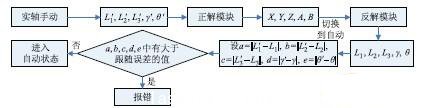 为了解决反解多解问题,在反解模块中引入变量来读取实轴实时坐标(),将其与反解计算值() 进行比较,取最接近实轴实时坐标的那组解作为输出,经过处理后驱动实轴运动.为了节省运算时间,此判断过程只在实轴单轴手动切换到自动状态时生效,判断过后一直采用选中的那组解的解析表达式计算实轴坐标,直到下次切换.