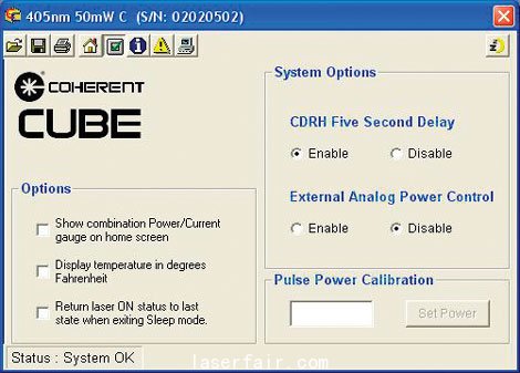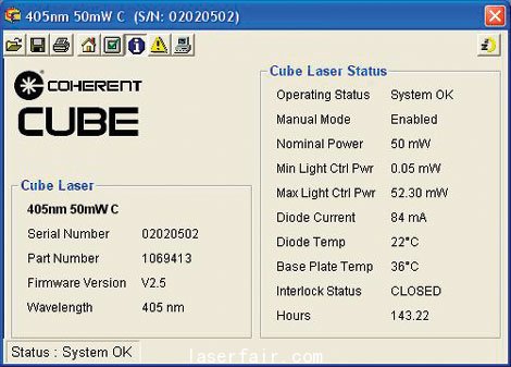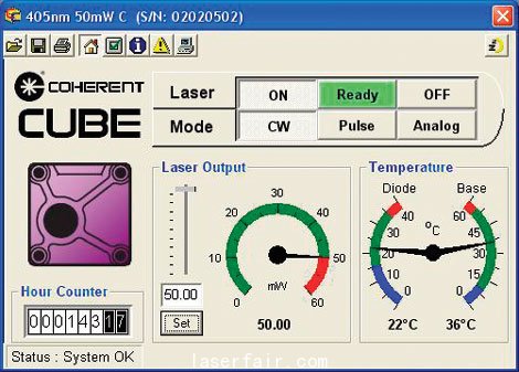 主页面提供计算机对CUBE的控制,包括激光器的开关,功率设置和模式选择。