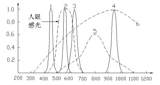 下图绘出几种由不同化合物半导体及掺杂制得LED光谱响应曲线。其中LED光谱分布曲线