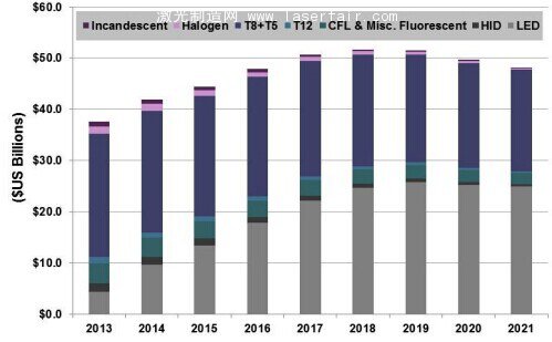 Navigant的研究预测表明全球商用LED的销售额一直到2019年都呈急剧增加趋势,而从2019年至2021年有轻微减少,但有些产品显著下降,如线性荧光灯类(包括T5、T8、T12),紧凑型荧光灯电灯(CFL)和高强度放电(HID)灯。从这个模型看到2021年全球照明收入减少,预计是由于SSL产品成本的下降,而不是销售单位放缓。然而,随着越来越多的长寿命LED灯售出,我们可以预期在更久的未来,替换型灯泡的销售量会持续下跌,而拥有附加功能的SSL产品,如可控性、色彩调整以及智能无线,将有可能为LED照明产品增加附加值,并在未来进一步增加LED的收入。