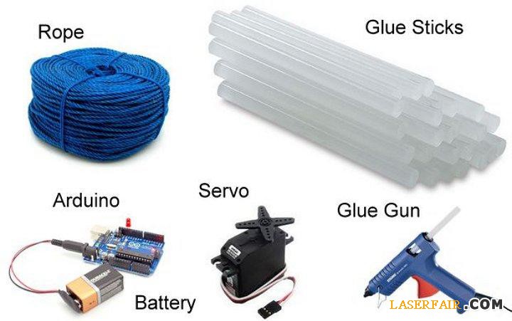 他说,只是一个非常简单的机器人,只需几根尼龙绳和热胶棒、一个或两个伺服、一块 Arduino Uno或任何能够驱动伺服和电池的微控制器。