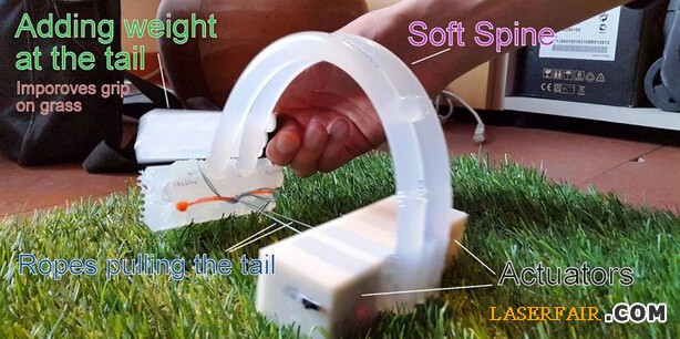 “好吧,它并非全部都是软的,但它有一些软的部分,比如热胶棒。”Mihaylov表示。“这些热胶棒在整个设计中起到了核心的作用,它们构成了软机器人的主体,而且由于有一定的弹性,它还起到了弹簧的作用,以此驱动机器人向前移动。”