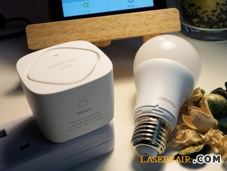 WeMo LED照明入门套装包括WeMo link讯号收发器及智能LED灯泡两组,其整个安装设定十分简单。用家第一步先将WeMo link讯号收发器插入电源及将智能LED灯泡置入灯座上,令两者互通互连,以及于行动装置中下载WeMo智能操控应用程序。