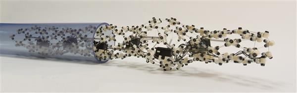 此外,CMMWorm最让人印象深刻的是它的收缩能力。“除了每段独立控制和具有可更换的网格属性之外,CMMWorm还具有很高的收缩率(可收缩至其最大直径的52%)。因此这种机器人可以游走管道如履平地。”他们说。将来这种CMM蠕虫机器人的微型版本甚至可以进入人体,执行一些类似内镜检查的任务等。更为详细的信息可点击此处浏览研究团队发表的关于这个机器人设计的论文。